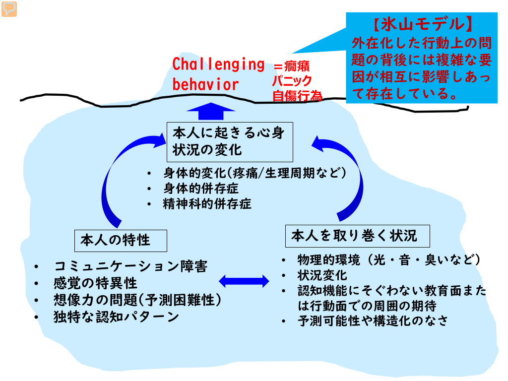#25. Challenging behavior =癇癪 パニック 自傷行為 【氷山モデル】 外在化した行動上の問 題の背後には複雑な要 因が相互に影響しあっ て存在している。 本人に起きる心身 状況の変化 • 身体的変化(疼痛/生理周期など) • 身体的併存症 • 精神科的併存症 本人の特性 • • • • コミュニケーション障害 感覚の特異性 想像力の問題(予測困難性) 独特な認知パターン 本人を取り巻く状況 • 物理的環境(光・音・臭いなど) • 状況変化 • 認知機能にそぐわない教育面また は行動面での周囲の期待 • 予測可能性や構造化のなさ