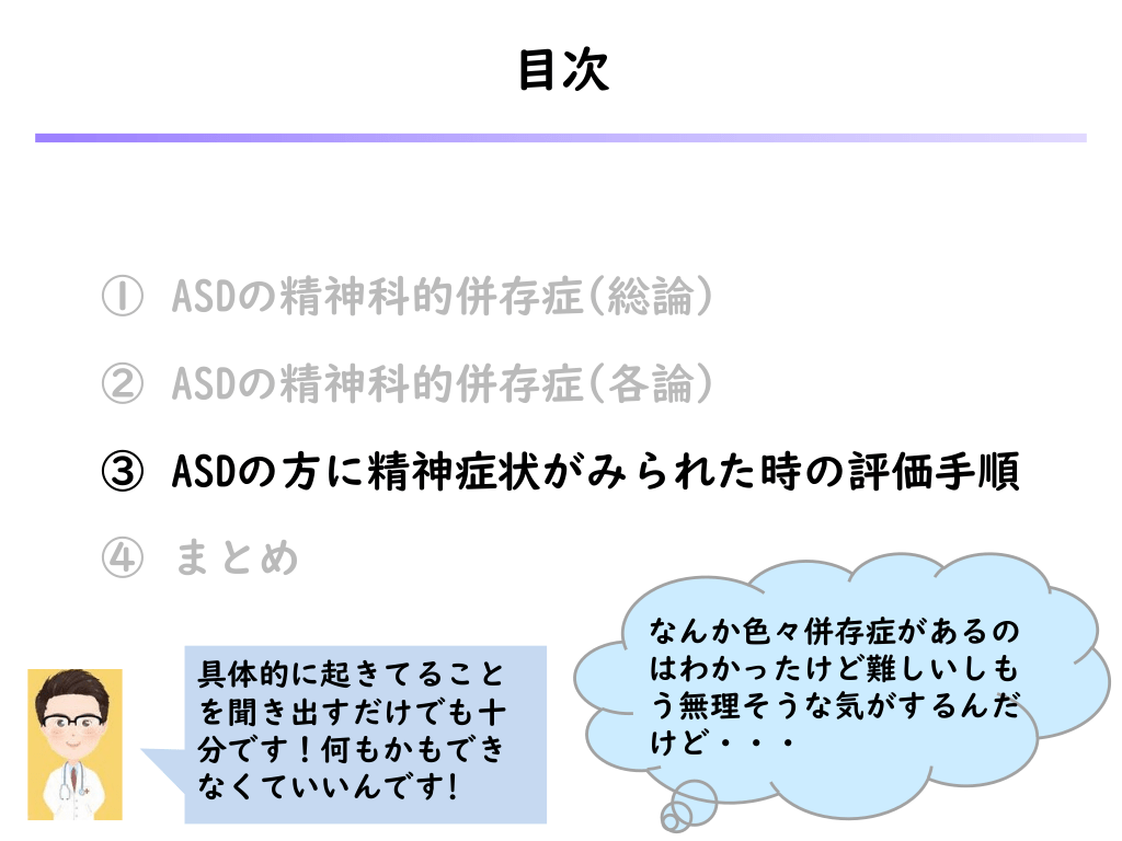 #2. 本スライドの対象者 • 初期研修医 • 精神科専攻医 • 小児科医 • ASD(Autism Spectrum Disorder;ASD)の方の 支援に関わる人全般 “ASDの診断がある(ありそうな)人に精神 科的な問題起きてそう…でも何きけばいい の…”と一度でも思ったことがある方向け