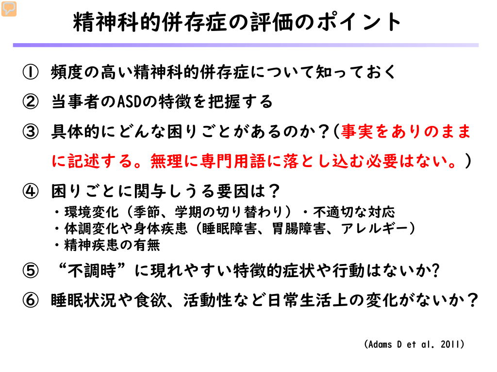 #28. 精神科的併存症の評価のポイント ① 頻度の高い精神科的併存症について知っておく ② 当事者のASDの特徴を把握する ③ 具体的にどんな困りごとがあるのか?(事実をありのまま に記述する。無理に専門用語に落とし込む必要はない。) ④ 困りごとに関与しうる要因は? ・環境変化(季節、学期の切り替わり)・不適切な対応 ・体調変化や身体疾患(睡眠障害、胃腸障害、アレルギー) ・精神疾患の有無 ⑤ “不調時”に現れやすい特徴的症状や行動はないか? ⑥ 睡眠状況や食欲、活動性など日常生活上の変化がないか? (Adams D et al. 2011)