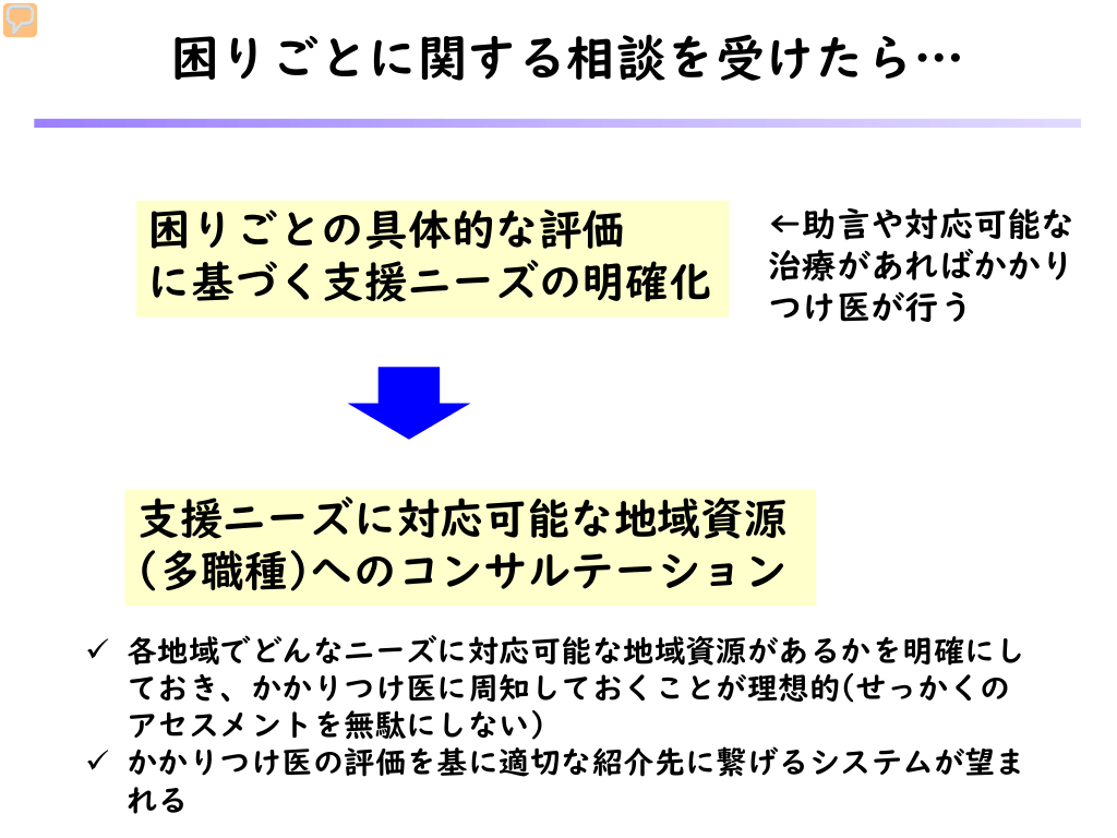 #29. 困りごとに関する相談を受けたら… 困りごとの具体的な評価 に基づく支援ニーズの明確化 ←助言や対応可能な 治療があればかかり つけ医が行う 支援ニーズに対応可能な地域資源 (多職種)へのコンサルテーション 各地域でどんなニーズに対応可能な地域資源があるかを明確にし ておき、かかりつけ医に周知しておくことが理想的(せっかくの アセスメントを無駄にしない) かかりつけ医の評価を基に適切な紹介先に繋げるシステムが望ま れる