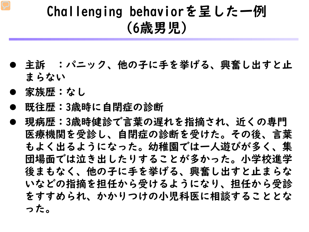 #30. Challenging behaviorを呈した一例 (6歳男児) 主訴 :パニック、他の子に手を挙げる、興奮し出すと止 まらない 家族歴:なし 既往歴:3歳時に自閉症の診断 現病歴:3歳時健診で言葉の遅れを指摘され、近くの専門 医療機関を受診し、自閉症の診断を受けた。その後、言葉 もよく出るようになった。幼稚園では一人遊びが多く、集 団場面では泣き出したりすることが多かった。小学校進学 後まもなく、他の子に手を挙げる、興奮し出すと止まらな いなどの指摘を担任から受けるようになり、担任から受診 をすすめられ、かかりつけの小児科医に相談することとな った。