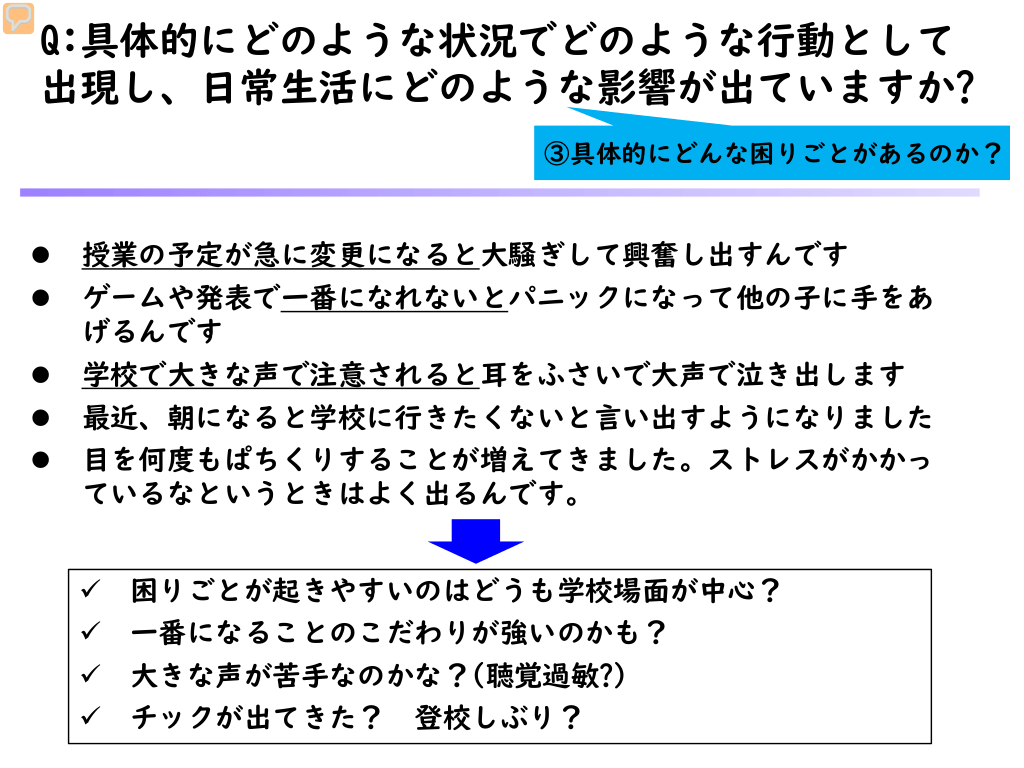 #31. Q:具体的にどのような状況でどのような行動として 出現し、日常生活にどのような影響が出ていますか? ③具体的にどんな困りごとがあるのか? 授業の予定が急に変更になると大騒ぎして興奮し出すんです ゲームや発表で一番になれないとパニックになって他の子に手をあ げるんです 学校で大きな声で注意されると耳をふさいで大声で泣き出します 最近、朝になると学校に行きたくないと言い出すようになりました 目を何度もぱちくりすることが増えてきました。ストレスがかかっ ているなというときはよく出るんです。 困りごとが起きやすいのはどうも学校場面が中心? 一番になることのこだわりが強いのかも? 大きな声が苦手なのかな?(聴覚過敏?) チックが出てきた? 登校しぶり?