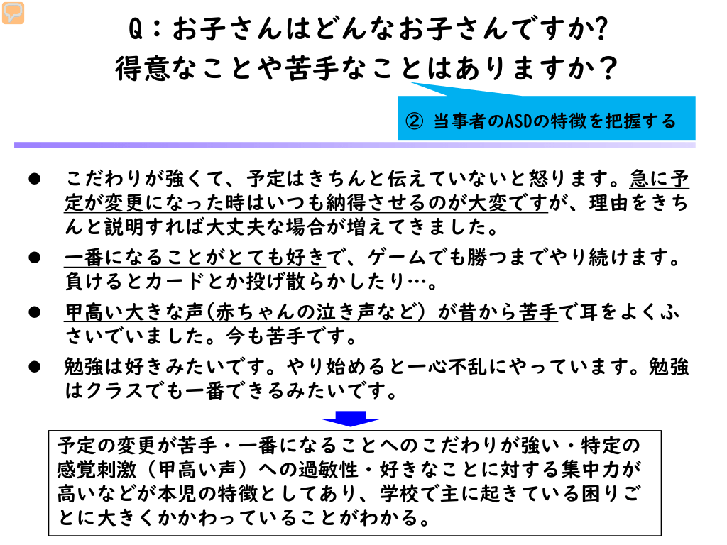 #32. Q:お子さんはどんなお子さんですか? 得意なことや苦手なことはありますか? ② 当事者のASDの特徴を把握する こだわりが強くて、予定はきちんと伝えていないと怒ります。急に予 定が変更になった時はいつも納得させるのが大変ですが、理由をきち んと説明すれば大丈夫な場合が増えてきました。 一番になることがとても好きで、ゲームでも勝つまでやり続けます。 負けるとカードとか投げ散らかしたり…。 甲高い大きな声(赤ちゃんの泣き声など)が昔から苦手で耳をよくふ さいでいました。今も苦手です。 勉強は好きみたいです。やり始めると一心不乱にやっています。勉強 はクラスでも一番できるみたいです。 予定の変更が苦手・一番になることへのこだわりが強い・特定の 感覚刺激(甲高い声)への過敏性・好きなことに対する集中力が 高いなどが本児の特徴としてあり、学校で主に起きている困りご とに大きくかかわっていることがわかる。
