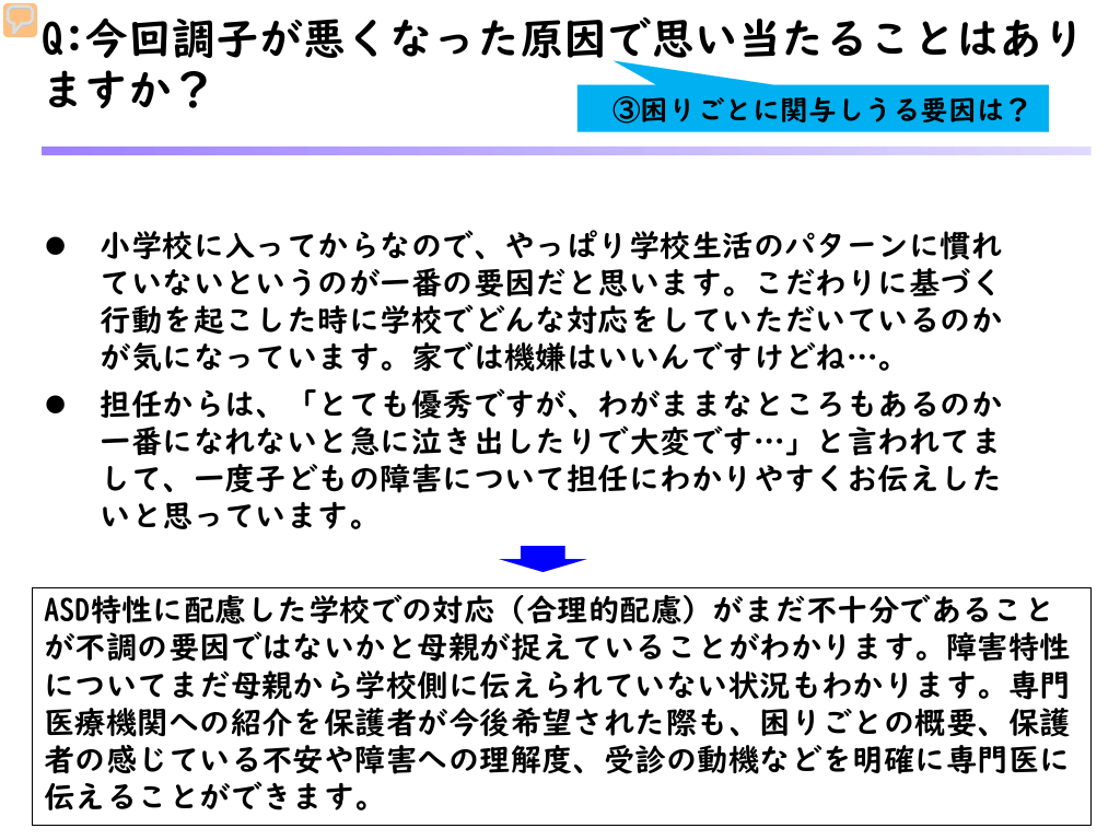 #33. Q:今回調子が悪くなった原因で思い当たることはあり ますか? ③困りごとに関与しうる要因は? 小学校に入ってからなので、やっぱり学校生活のパターンに慣れ ていないというのが一番の要因だと思います。こだわりに基づく 行動を起こした時に学校でどんな対応をしていただいているのか が気になっています。家では機嫌はいいんですけどね…。 担任からは、「とても優秀ですが、わがままなところもあるのか 一番になれないと急に泣き出したりで大変です…」と言われてま して、一度子どもの障害について担任にわかりやすくお伝えした いと思っています。 ASD特性に配慮した学校での対応(合理的配慮)がまだ不十分であること が不調の要因ではないかと母親が捉えていることがわかります。障害特性 についてまだ母親から学校側に伝えられていない状況もわかります。専門 医療機関への紹介を保護者が今後希望された際も、困りごとの概要、保護 者の感じている不安や障害への理解度、受診の動機などを明確に専門医に 伝えることができます。