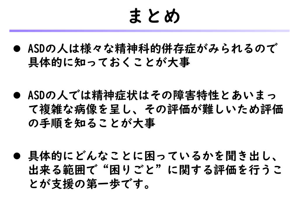 #34. まとめ ASDの人は様々な精神科的併存症がみられるので 具体的に知っておくことが大事 ASDの人では精神症状はその障害特性とあいまっ て複雑な病像を呈し、その評価が難しいため評価 の手順を知ることが大事 具体的にどんなことに困っているかを聞き出し、 出来る範囲で“困りごと”に関する評価を行うこ とが支援の第一歩です。