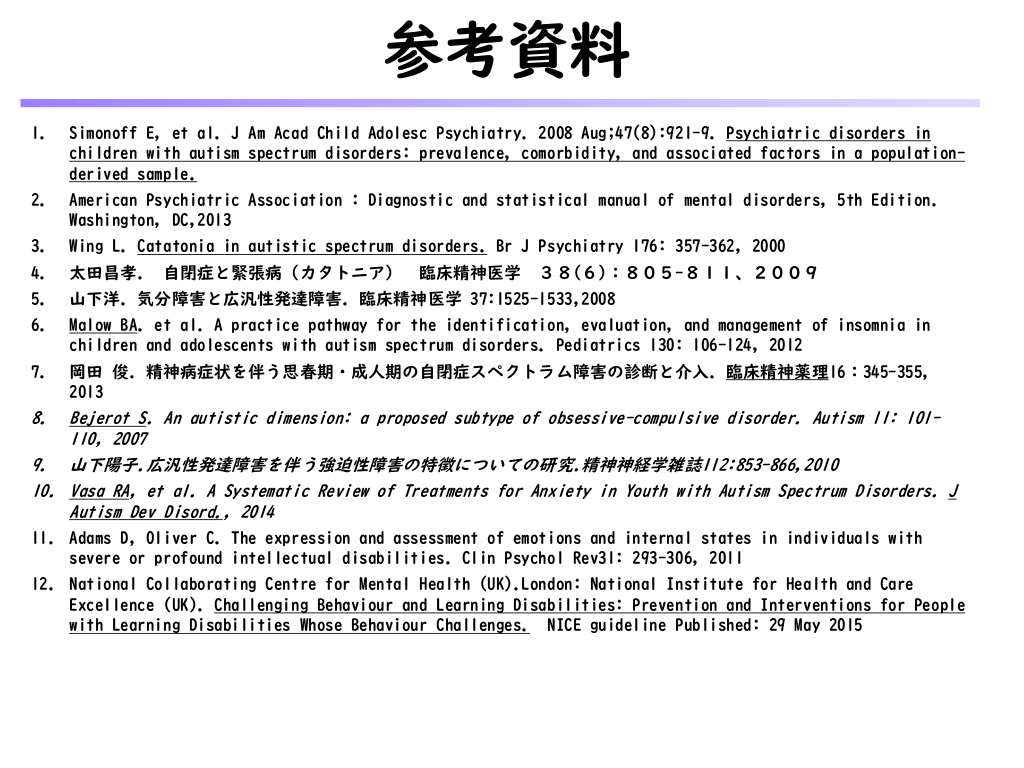 #35. 参考資料 1. Simonoff E, et al. J Am Acad Child Adolesc Psychiatry. 2008 Aug;47(8):921-9. Psychiatric disorders in children with autism spectrum disorders: prevalence, comorbidity, and associated factors in a populationderived sample. 2. American Psychiatric Association : Diagnostic and statistical manual of mental disorders, 5th Edition. Washington, DC,2013 3. Wing L. Catatonia in autistic spectrum disorders. Br J Psychiatry 176: 357-362, 2000 4. 太田昌孝. 5. 山下洋. 気分障害と広汎性発達障害. 臨床精神医学 37:1525-1533,2008 6. Malow BA. et al. A practice pathway for the identification, evaluation, and management of insomnia in children and adolescents with autism spectrum disorders. Pediatrics 130: 106-124, 2012 7. 岡田 俊. 精神病症状を伴う思春期・成人期の自閉症スペクトラム障害の診断と介入. 臨床精神薬理16:345-355, 2013 自閉症と緊張病(カタトニア) 臨床精神医学 38(6):805-811、2009 8. Bejerot S. An autistic dimension: a proposed subtype of obsessive-compulsive disorder. Autism 11: 101110, 2007 9. 山下陽子.広汎性発達障害を伴う強迫性障害の特徴についての研究.精神神経学雑誌112:853-866,2010 10. Vasa R