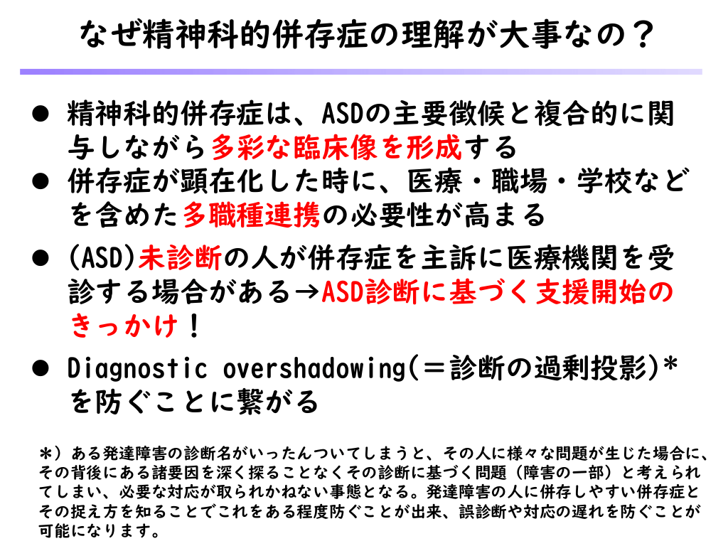 #5. なぜ精神科的併存症の理解が大事なの? 精神科的併存症は、ASDの主要徴候と複合的に関 与しながら多彩な臨床像を形成する 併存症が顕在化した時に、医療・職場・学校など を含めた多職種連携の必要性が高まる (ASD)未診断の人が併存症を主訴に医療機関を受 診する場合がある→ASD診断に基づく支援開始の きっかけ! Diagnostic overshadowing(=診断の過剰投影)* を防ぐことに繋がる *)ある発達障害の診断名がいったんついてしまうと、その人に様々な問題が生じた場合に、 その背後にある諸要因を深く探ることなくその診断に基づく問題(障害の一部)と考えられ てしまい、必要な対応が取られかねない事態となる。発達障害の人に併存しやすい併存症と その捉え方を知ることでこれをある程度防ぐことが出来、誤診断や対応の遅れを防ぐことが 可能になります。