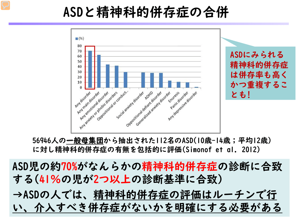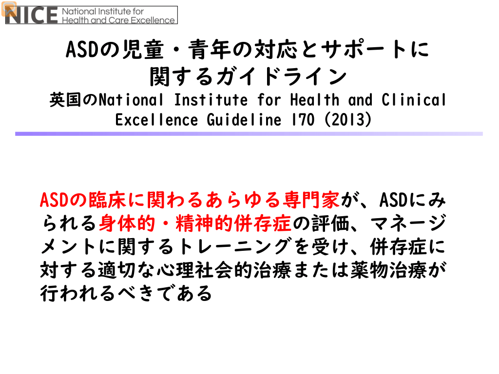 #7. ASDの児童・青年の対応とサポートに 関するガイドライン 英国のNational Institute for Health and Clinical Excellence Guideline 170(2013) ASDの臨床に関わるあらゆる専門家が、ASDにみ られる身体的・精神的併存症の評価、マネージ メントに関するトレーニングを受け、併存症に 対する適切な心理社会的治療または薬物治療が 行われるべきである