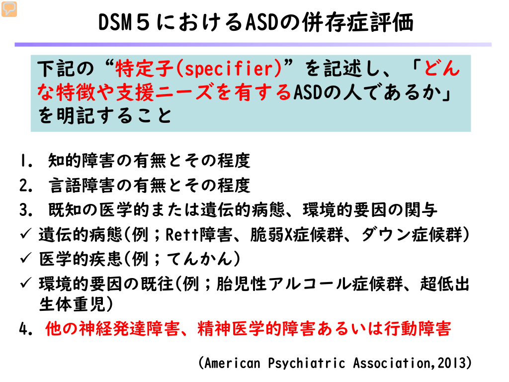 #8. DSM5におけるASDの併存症評価 下記の“特定子(specifier)”を記述し、「どん な特徴や支援ニーズを有するASDの人であるか」 を明記すること 1. 知的障害の有無とその程度 2. 言語障害の有無とその程度 3. 既知の医学的または遺伝的病態、環境的要因の関与 遺伝的病態(例;Rett障害、脆弱X症候群、ダウン症候群) 医学的疾患(例;てんかん) 環境的要因の既往(例;胎児性アルコール症候群、超低出 生体重児) 4.他の神経発達障害、精神医学的障害あるいは行動障害 (American Psychiatric Association,2013)