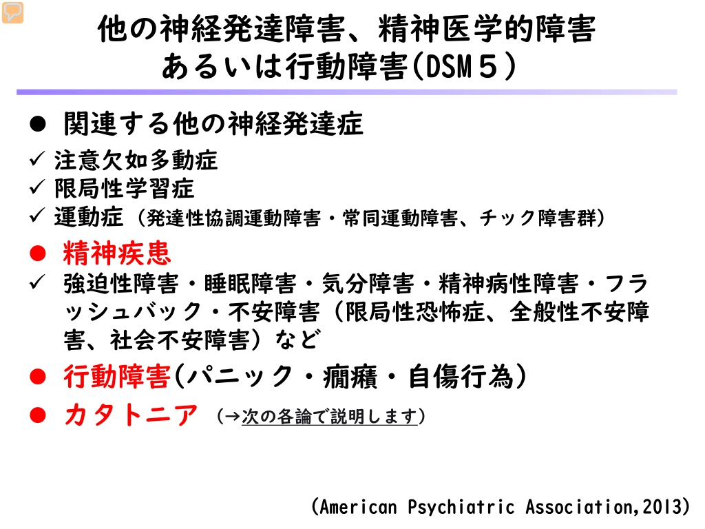 #9. 他の神経発達障害、精神医学的障害 あるいは行動障害(DSM5) 関連する他の神経発達症 注意欠如多動症 限局性学習症 運動症 (発達性協調運動障害・常同運動障害、チック障害群) 精神疾患 強迫性障害・睡眠障害・気分障害・精神病性障害・フラ ッシュバック・不安障害(限局性恐怖症、全般性不安障 害、社会不安障害)など 行動障害(パニック・癇癪・自傷行為) カタトニア (→次の各論で説明します) (American Psychiatric Association,2013)