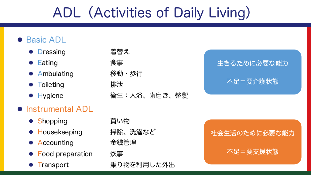 #10. ADL(Activities of Daily Living) l Basic ADL l Dressing 着替え l Eating 食事 l Ambulating 移動・歩行 l Toileting 排泄 l Hygiene 衛生:入浴、歯磨き、整髪 生きるために必要な能力 不足=要介護状態 l Instrumental ADL l Shopping 買い物 l Housekeeping 掃除、洗濯など l Accounting 金銭管理 l Food preparation 炊事 l Transport 乗り物を利用した外出 社会生活のために必要な能力 不足=要支援状態