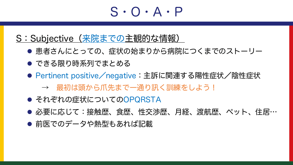 #12. S・O・A・P S:Subjective(来院までの主観的な情報) l 患者さんにとっての、症状の始まりから病院につくまでのストーリー l できる限り時系列でまとめる l Pertinent positive/negative:主訴に関連する陽性症状/陰性症状 → 最初は頭から爪先まで一通り訊く訓練をしよう! l それぞれの症状についてのOPQRSTA l 必要に応じて:接触歴、食歴、性交渉歴、月経、渡航歴、ペット、住居… l 前医でのデータや熱型もあれば記載