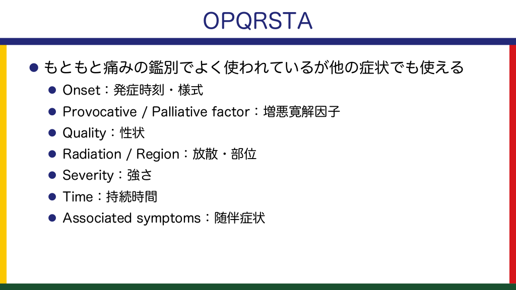 #13. OPQRSTA l もともと痛みの鑑別でよく使われているが他の症状でも使える l Onset:発症時刻・様式 l Provocative / Palliative factor:増悪寛解因子 l Quality:性状 l Radiation / Region:放散・部位 l Severity:強さ l Time:持続時間 l Associated symptoms:随伴症状