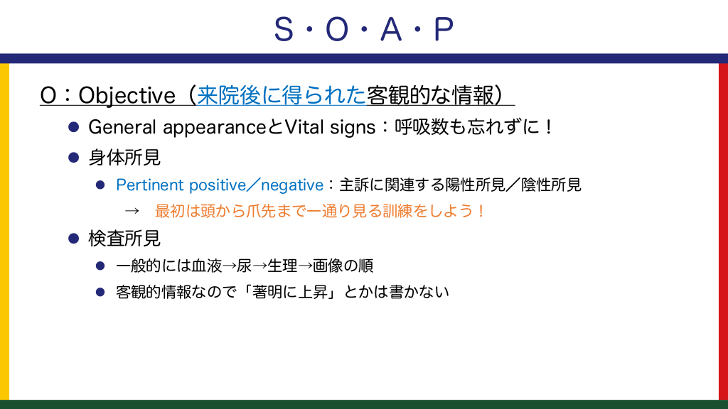 #14. S・O・A・P O:Objective(来院後に得られた客観的な情報) l General appearanceとVital signs:呼吸数も忘れずに! l 身体所見 l Pertinent positive/negative:主訴に関連する陽性所見/陰性所見 → 最初は頭から爪先まで一通り見る訓練をしよう! l 検査所見 l 一般的には血液→尿→生理→画像の順 l 客観的情報なので「著明に上昇」とかは書かない