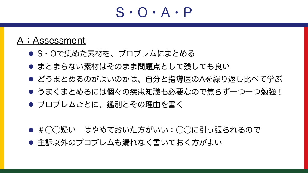 #15. S・O・A・P A:Assessment l S・Oで集めた素材を、プロブレムにまとめる l まとまらない素材はそのまま問題点として残しても良い l どうまとめるのがよいのかは、自分と指導医のAを繰り返し比べて学ぶ l うまくまとめるには個々の疾患知識も必要なので焦らず一つ一つ勉強! l プロブレムごとに、鑑別とその理由を書く l #◯◯疑い はやめておいた方がいい:◯◯に引っ張られるので l 主訴以外のプロブレムも漏れなく書いておく方がよい