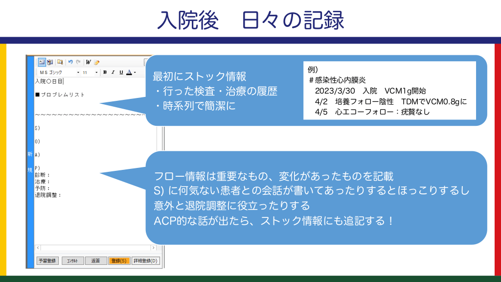#20. 入院後 日々の記録 最初にストック情報 ・行った検査・治療の履歴 ・時系列で簡潔に 例) #感染性心内膜炎 2023/3/30 入院 VCM1g開始 4/2 培養フォロー陰性 TDMでVCM0.8gに 4/5 心エコーフォロー:疣贅なし フロー情報は重要なもの、変化があったものを記載 S) に何気ない患者との会話が書いてあったりするとほっこりするし 意外と退院調整に役立ったりする ACP的な話が出たら、ストック情報にも追記する!