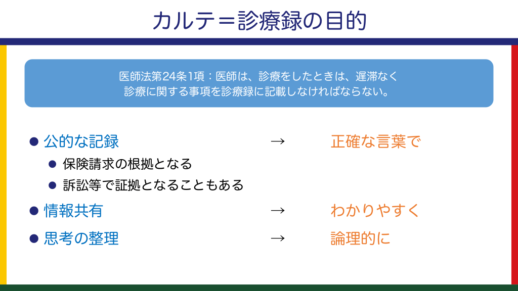 #3. カルテ=診療録の目的 医師法第24条1項:医師は、診療をしたときは、遅滞なく 診療に関する事項を診療録に記載しなければならない。 l 公的な記録 → 正確な言葉で l 情報共有 → わかりやすく l 思考の整理 → 論理的に l 保険請求の根拠となる l 訴訟等で証拠となることもある