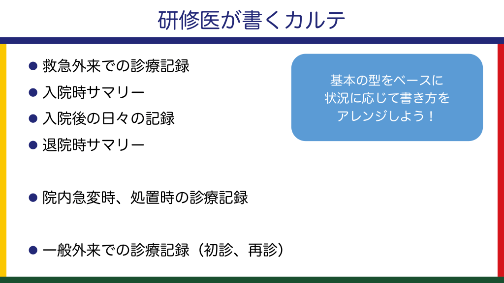#8. 研修医が書くカルテ l 救急外来での診療記録 l 入院時サマリー l 入院後の日々の記録 l 退院時サマリー l 院内急変時、処置時の診療記録 l 一般外来での診療記録(初診、再診) 基本の型をベースに 状況に応じて書き方を アレンジしよう!