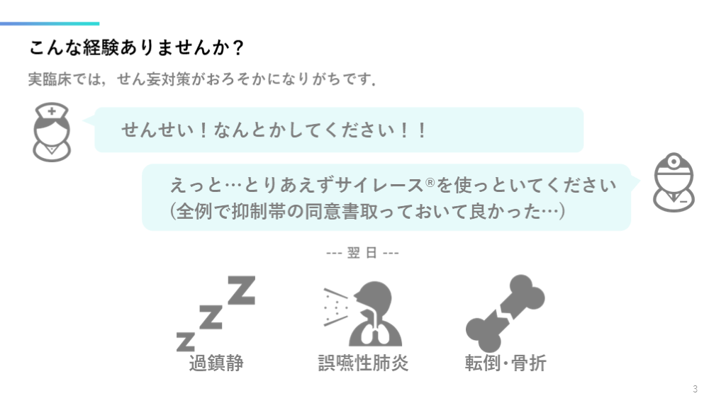 #3. --- 翌 日 --- こんな経験ありませんか? 実臨床では,せん妄対策がおろそかになりがちです.  せんせい!なんとかしてください!!  えっと…とりあえずサイレース®を使っといてください