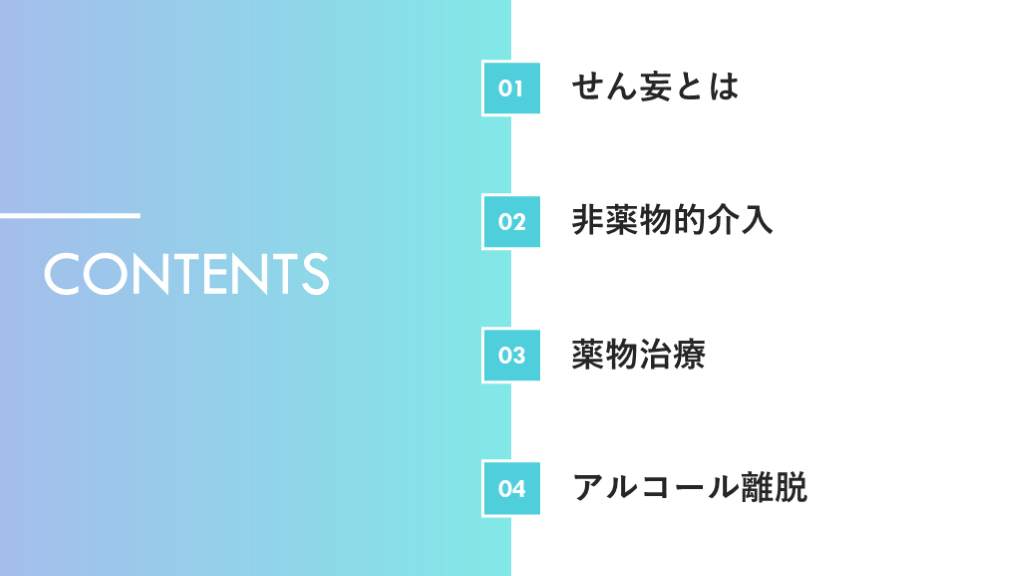 #6. せん妄とは 非薬物的介入 薬物治療 アルコール離脱 01 02 03 04 CONTENTS