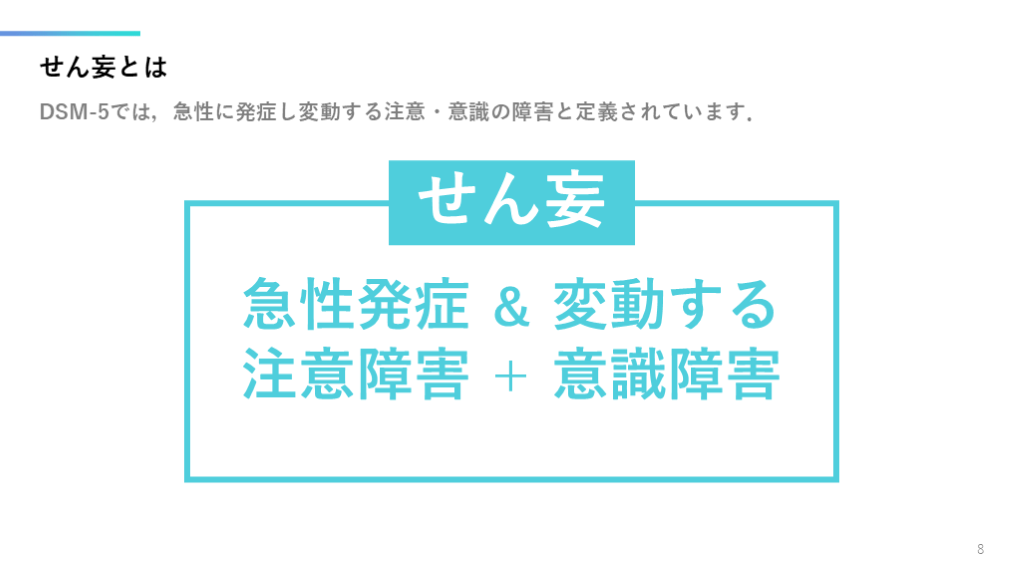 注意障害 + 意識障害 8 せん妄とは DSM-5では,急性に発症し変動する注意・意識の障害と定義されています.  せん妄