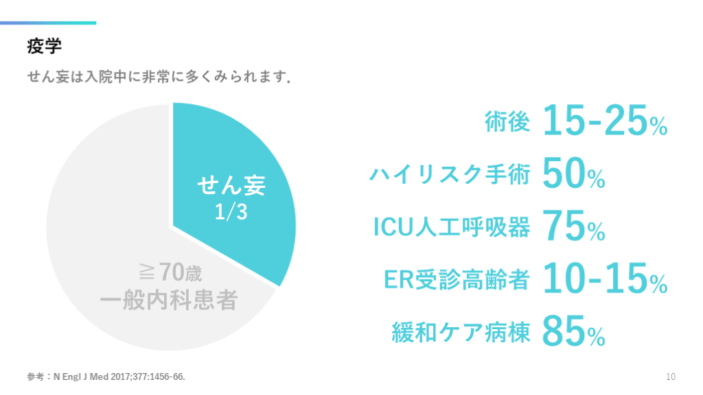 #10. 参考:N Engl J Med 2017;377:1456-66. 10 疫学 せん妄は入院中に非常に多くみられます. せん妄