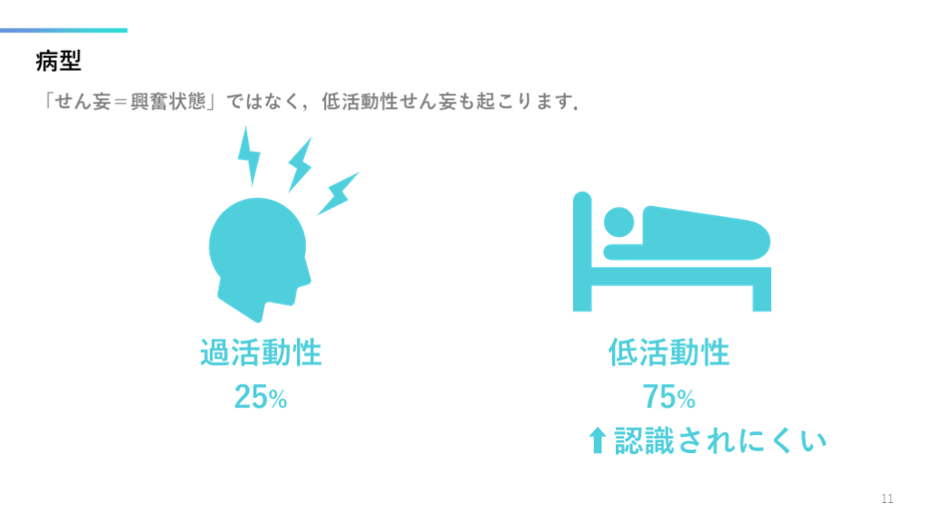 #11. 11 病型 「せん妄=興奮状態」ではなく,低活動性せん妄も起こります. ⬆認識されにくい