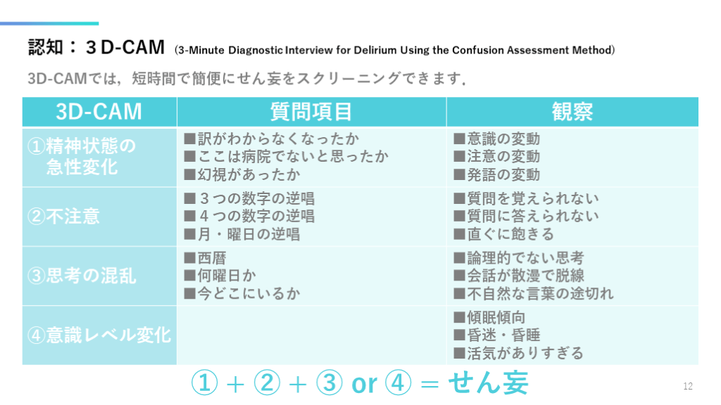 #12. 12 認知:3D-CAM  (3-Minute Diagnostic Interview for Delirium Using the Confusion Assessment Method) 3D-CAMでは,短時間で簡便にせん妄をスクリーニングできます. ① + ② + ③ or ④ = せん妄