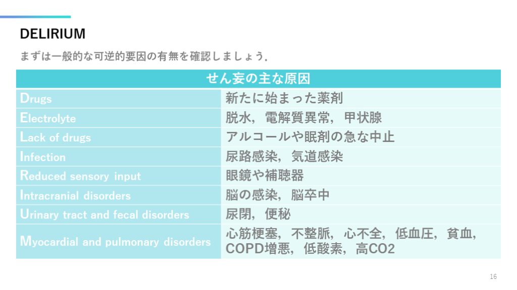 #16. 16 DELIRIUM まずは一般的な可逆的要因の有無を確認しましょう.