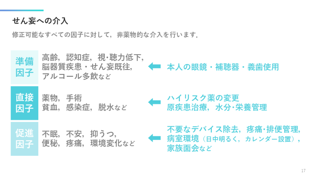 #17. 17 せん妄への介入 修正可能なすべての因子に対して,非薬物的な介入を行います.