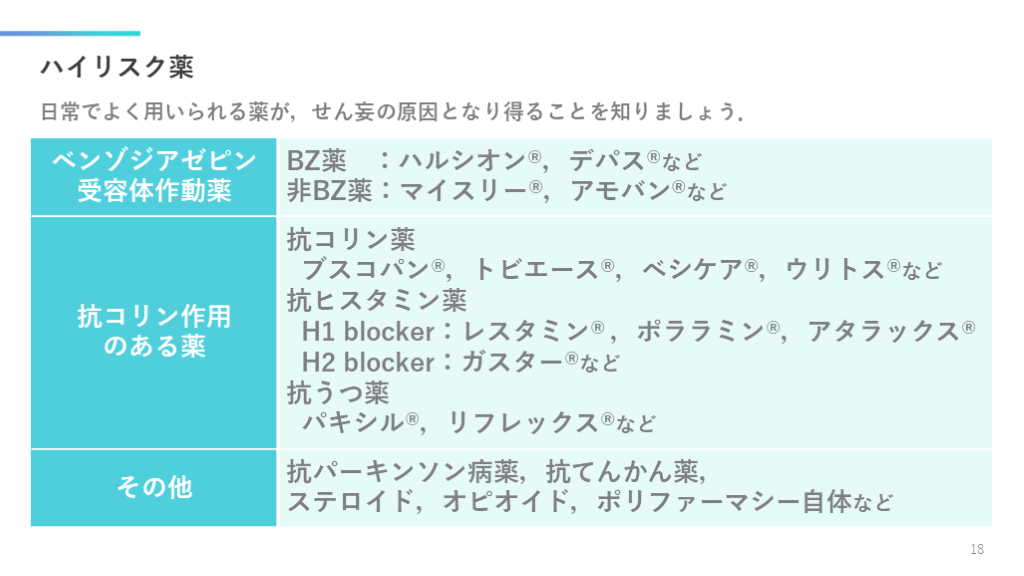 #18. ハイリスク薬 日常でよく用いられる薬が,せん妄の原因となり得ることを知りましょう. 18