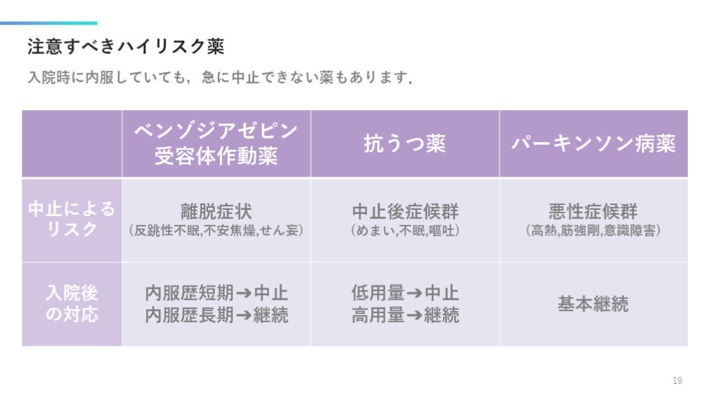 #19. 19 注意すべきハイリスク薬 入院時に内服していても,急に中止できない薬もあります.