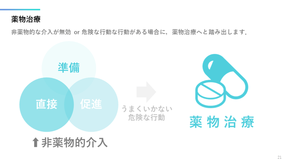 #21. 21 薬物治療 非薬物的な介入が無効 or 危険な行動な行動がある場合に,薬物治療へと踏み出します. 準備 促進 直接 ⬆非薬物的介入 うまくいかない
