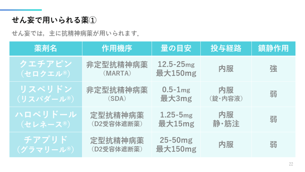 #22. 22 せん妄で用いられる薬① せん妄では,主に抗精神病薬が用いられます.