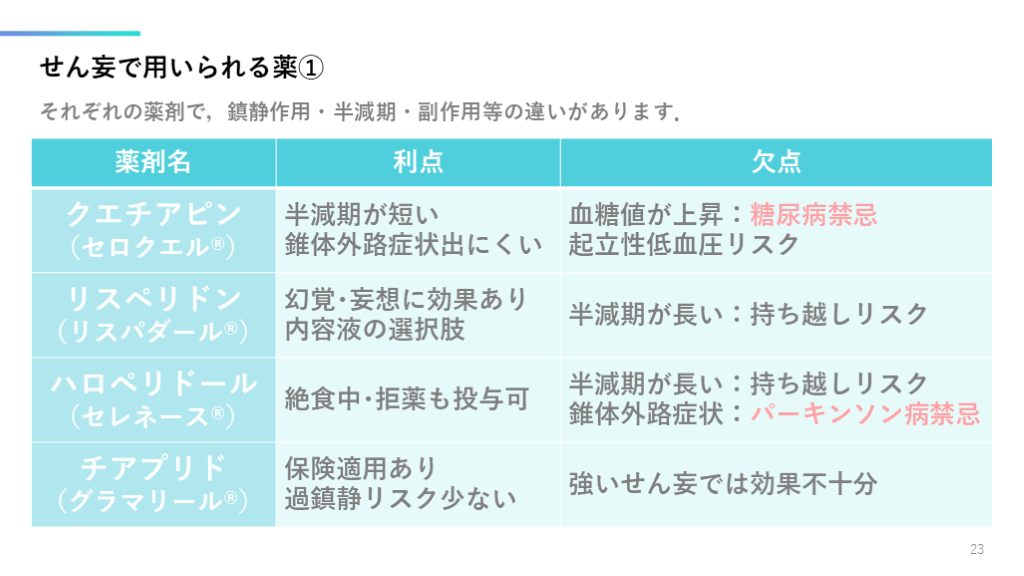 #23. 23 せん妄で用いられる薬① それぞれの薬剤で,鎮静作用・半減期・副作用等の違いがあります.