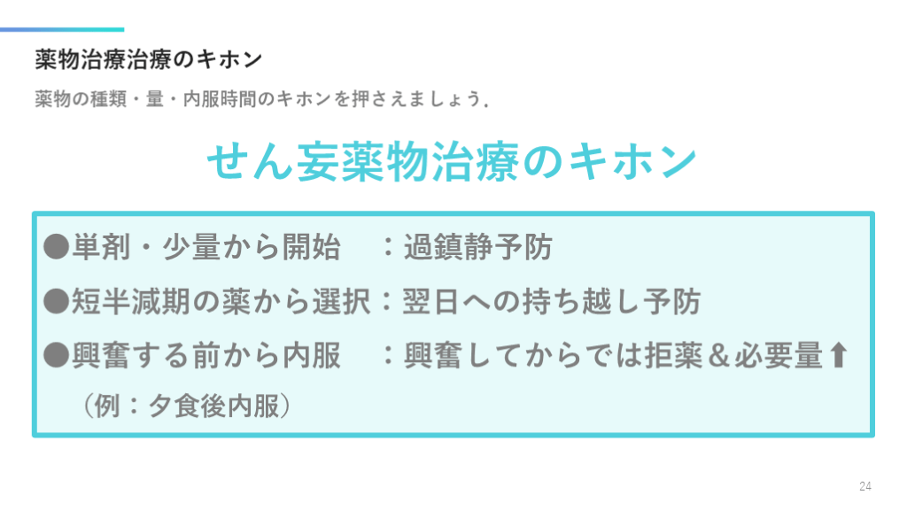 #24. 薬物治療治療のキホン 薬物の種類・量・内服時間のキホンを押さえましょう. 24 ●単剤・少量から開始 :過鎮静予防