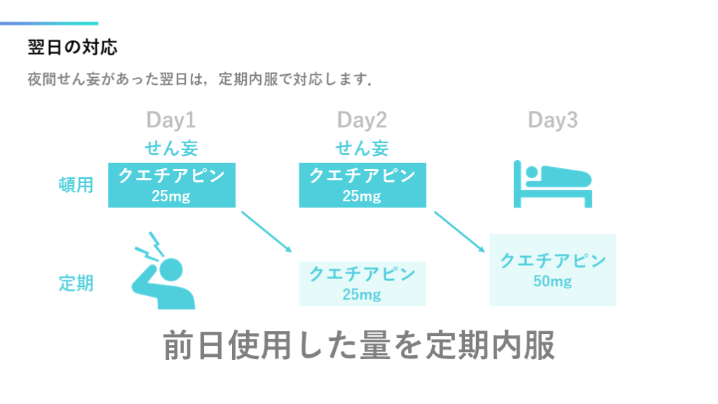 #25. 翌日の対応 夜間せん妄があった翌日は,定期内服で対応します. 前日使用した量を定期内服