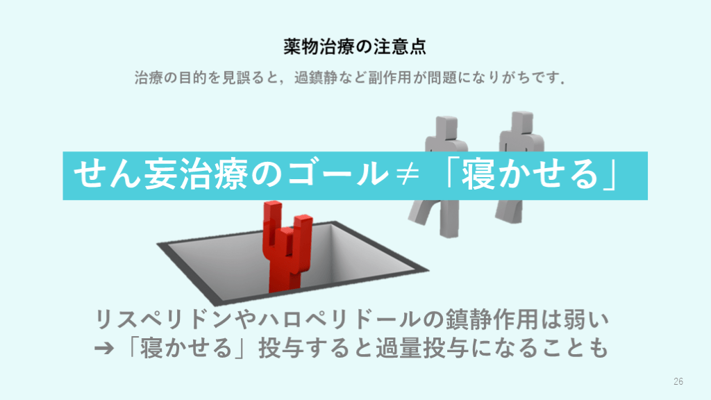 #26. 26 薬物治療の注意点 治療の目的を見誤ると,過鎮静など副作用が問題になりがちです. リスペリドンやハロペリドールの鎮静作用は弱い