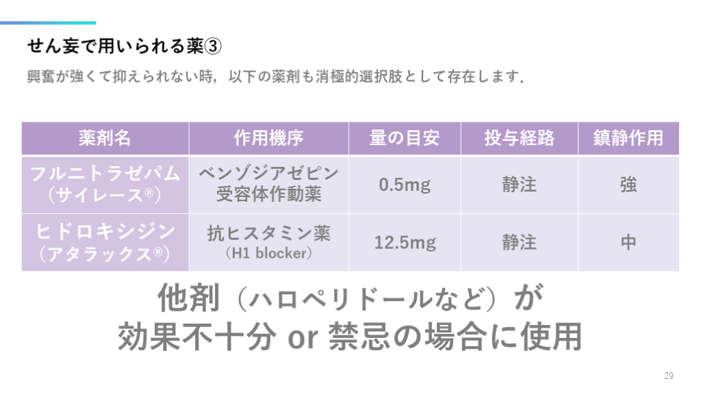 #29. 29 せん妄で用いられる薬③ 興奮が強くて抑えられない時,以下の薬剤も消極的選択肢として存在します. 他剤(ハロペリドールなど)が