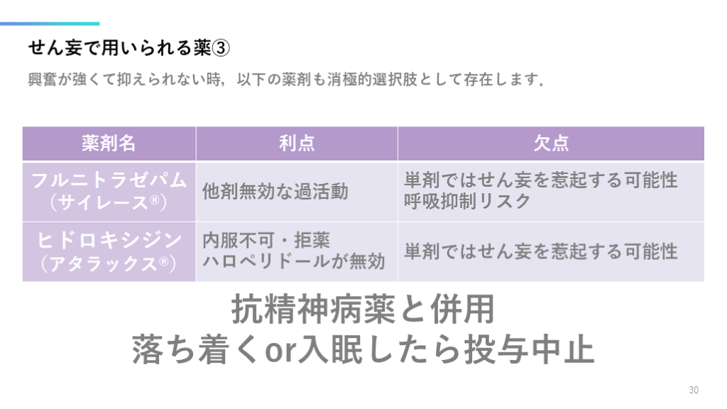#30. 30 せん妄で用いられる薬③ 興奮が強くて抑えられない時,以下の薬剤も消極的選択肢として存在します. 抗精神病薬と併用