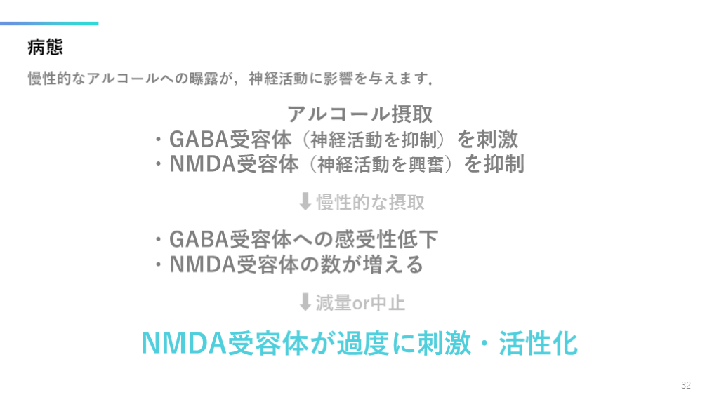 #32. 32 病態 慢性的なアルコールへの曝露が,神経活動に影響を与えます. アルコール摂取