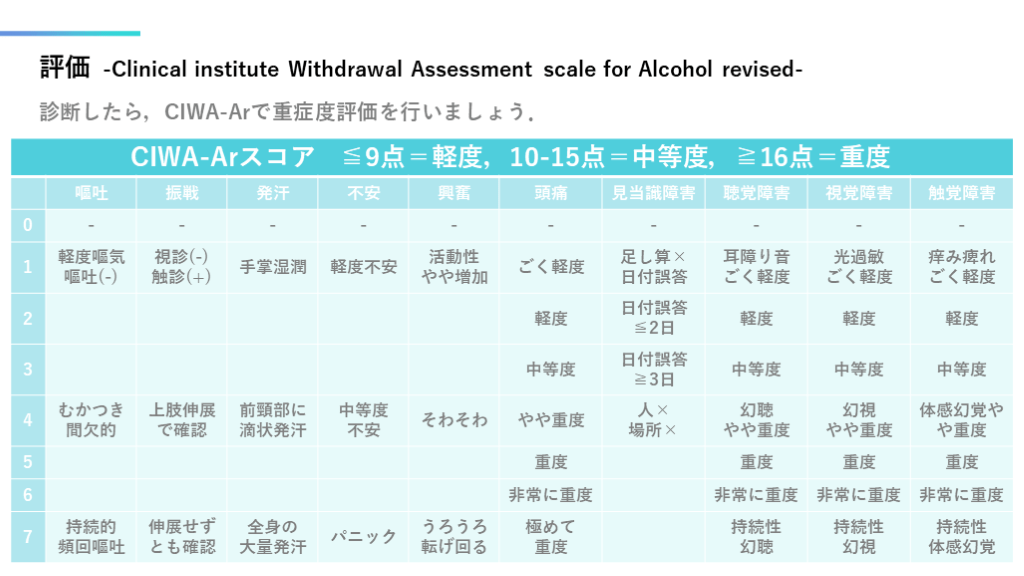 #36. 36 評価  -Clinical institute Withdrawal Assessment scale for Alcohol revised- 診断したら,CIWA-Arで重症度評価を行いましょう. CIVA-Ar