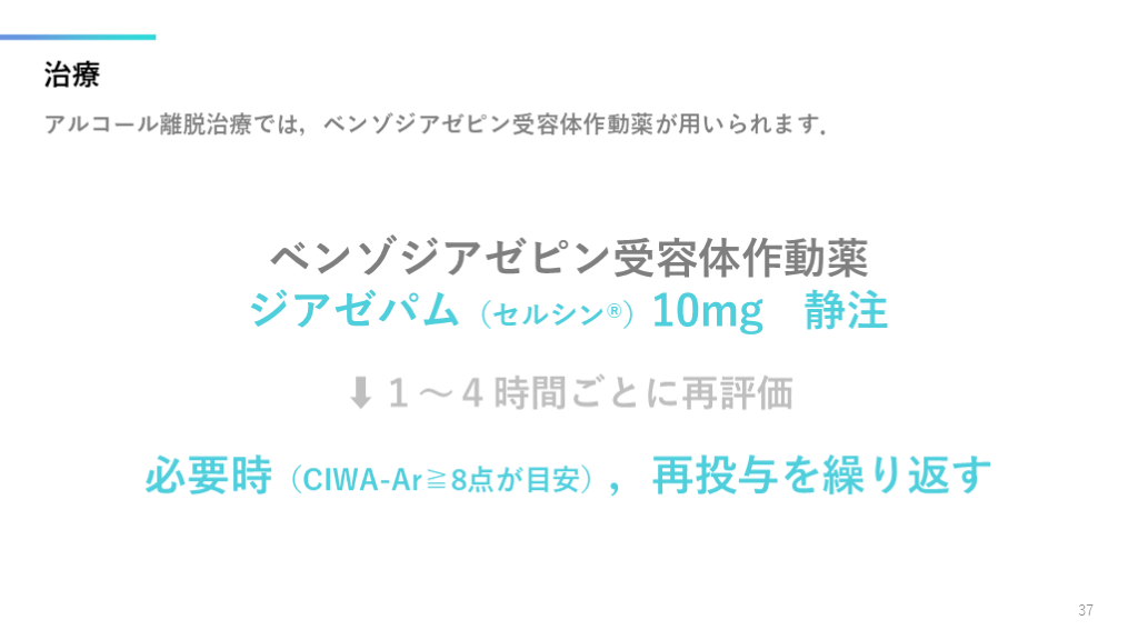 #37. 37 治療 アルコール離脱治療では,ベンゾジアゼピン受容体作動薬が用いられます.