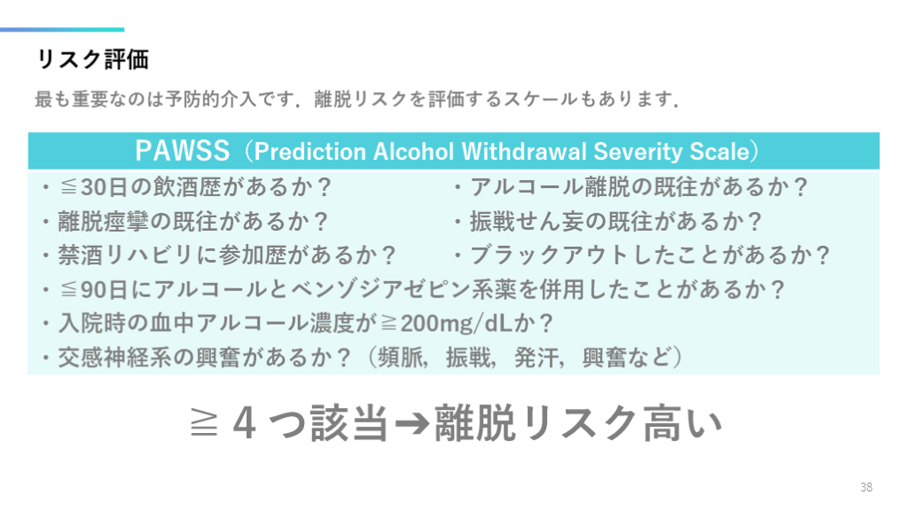 #39. 39 予防 離脱リスクが高い患者では,予防投薬を開始します.