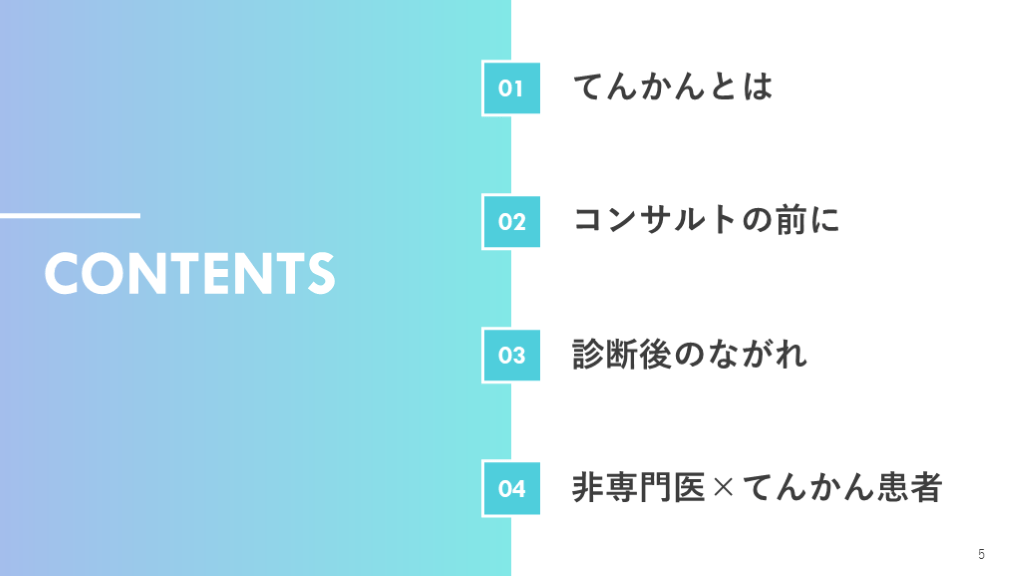 #6. CONTENTS 5 てんかんとは コンサルトの前に 診断後のながれ 非専門医×てんかん患者 01 02 03 04