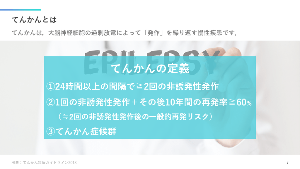 #8. てんかんとは てんかんは,大脳神経細胞の過剰放電によって「発作」を繰り返す慢性疾患です. 出典:てんかん診療ガイドライン2018 7 てんかんの定義