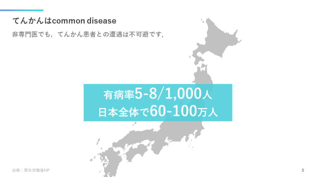 #9. てんかんはcommon disease 非専門医でも,てんかん患者との遭遇は不可避です. 出典:厚生労働省HP 8 有病率5-8/1,000人