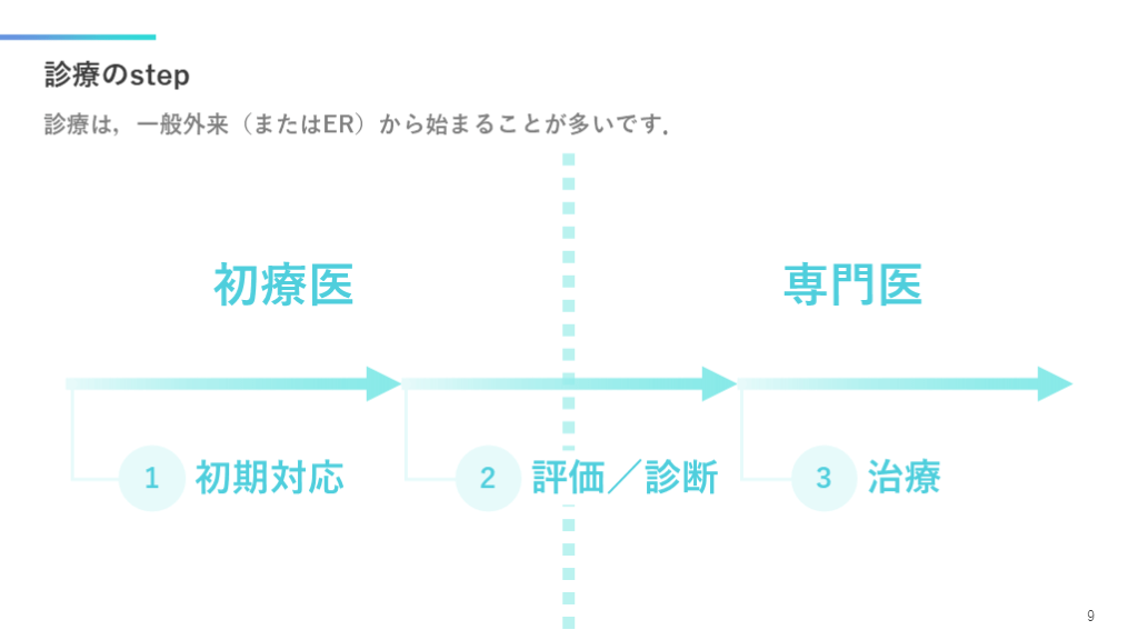 #10. 診療のstep 診療は,一般外来(またはER)から始まることが多いです. 9 初期対応 評価/診断 治療 初療医 専門医 1 2 3
