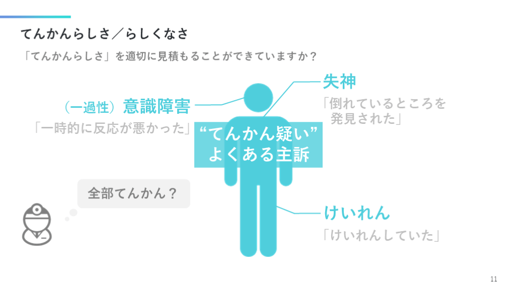 #12. てんかんらしさ/らしくなさ 「てんかんらしさ」を適切に見積もることができていますか? 11 (一過性)意識障害 失神 けいれん 「一時的に反応が悪かった」 「けいれんしていた」 「倒れているところを