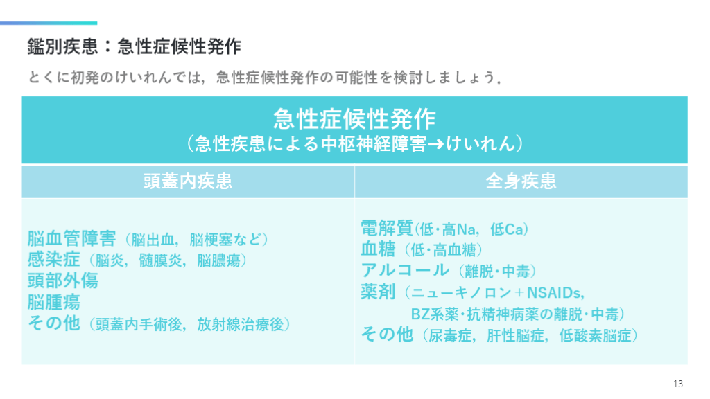 #14. 鑑別疾患:急性症候性発作 とくに初発のけいれんでは,急性症候性発作の可能性を検討しましょう. 13